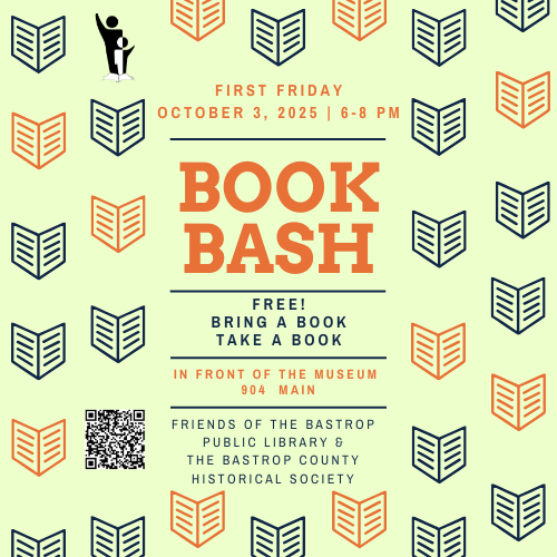 Join the Friends of the Bastrop Public Library & the Bastrop County Historical Society & Visitor Center for a Book Bash in front of the Museum on Friday, October 3, 2025 6 PM-8 PM.
