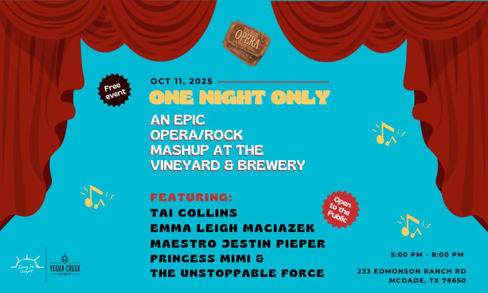 Opera Meets Rock — One Night Only 🎭🤘” At Yegua Creek Brewery & Restaurant at Rising Sun Vineyard
