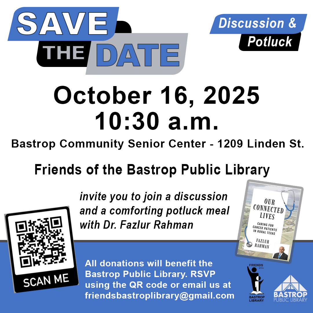 Join the Friends of the Bastrop Public Library at the Bastrop Community Senior Center for a potluck and a discussion of Dr. Fazlur Rahman's book Our Connected Lives: Caring for Cancer Patients in Rural Texas.