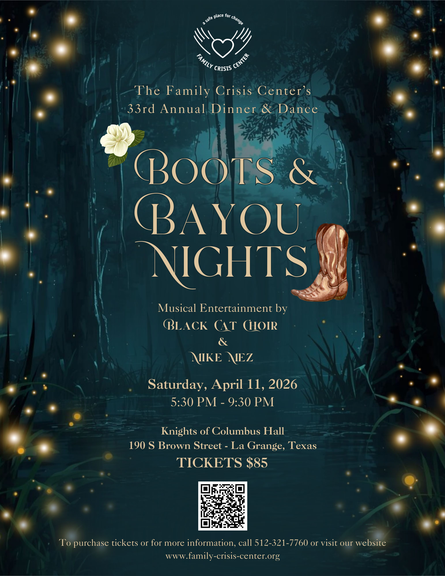 Join us for an enchanting evening at our 33rd Annual Dinner & Dance: Boots & Bayou Nights! The evening will include a catered dinner, live & silent auctions, entertainment, and dancing! Musical entertainment by Black Cat Choir and Mike Mez. If you would like information on becoming a sponsor, contact us at 512-321-7760 or email us at events@familycrisiscenter.usImages