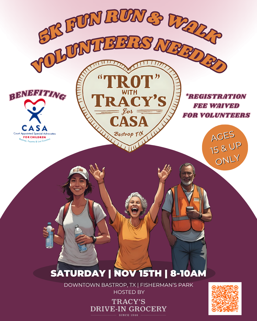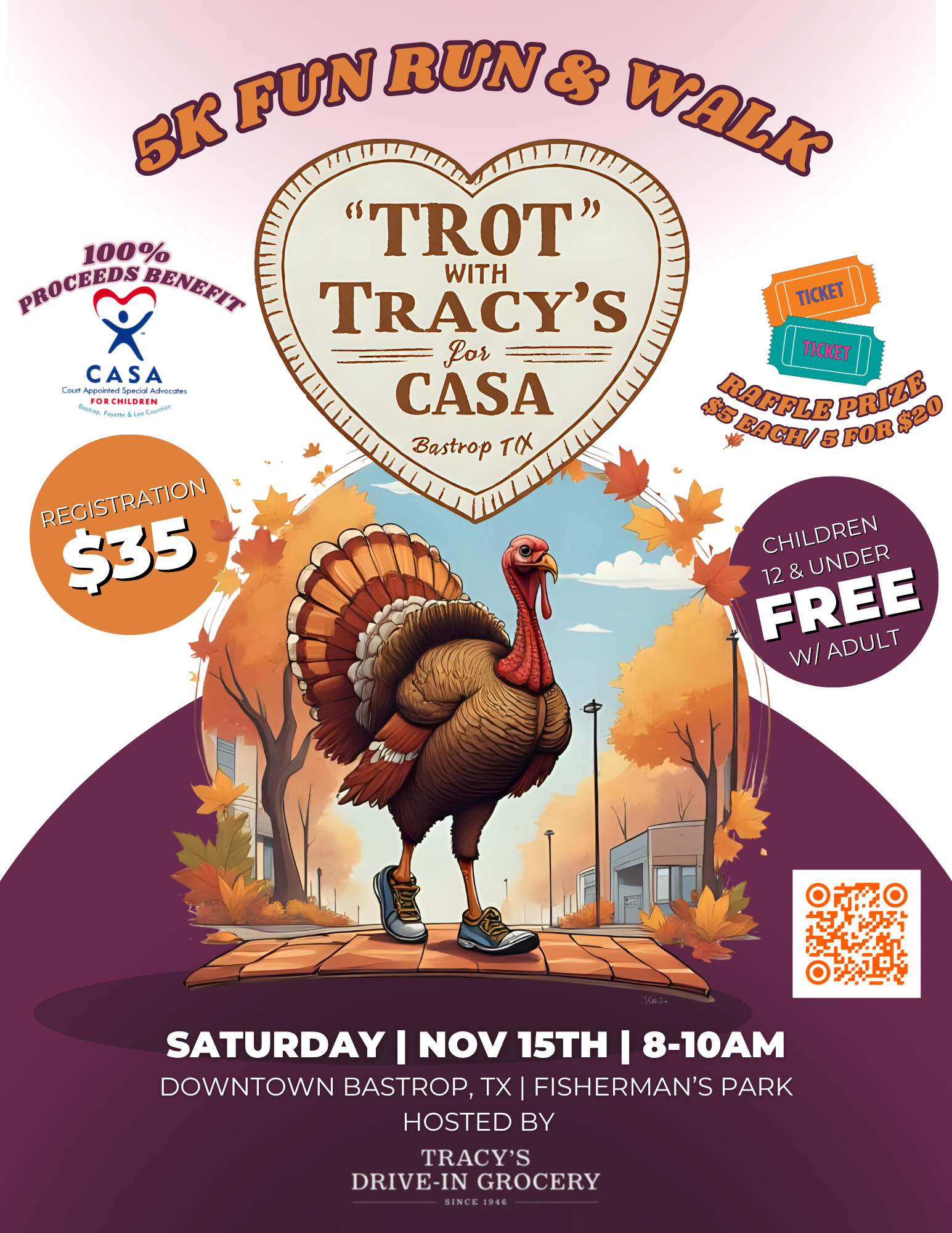Get Ready to Trot with Tracy's for CASA 🦃 Join us on Saturday, November 15th from 8-10AM at Fisherman's Park in Downtown Bastrop for a festive 5k Fun Run & Walk hosted by Tracy's Drive-In Grocery and benefiting CASA of Bastrop, Fayette & Lee Counties. 👟Registration is $35/ participant | Kids 12 and under participate free with an adult! 💙100% of proceeds help CASA provide trained advocates for children in foster care. 🎟Raffle tickets available to add-on with registration - $5 each or 5 for $20 🎉Win a Fellow Aiden Precision Coffee Maker valued at $399.95! 🎉Join us at Tracy's Drive-In Grocery after the trot ends for an epic after-party! Check out more details on the registration form and get ready to run, walk, or trot for a cause that makes a big impact!