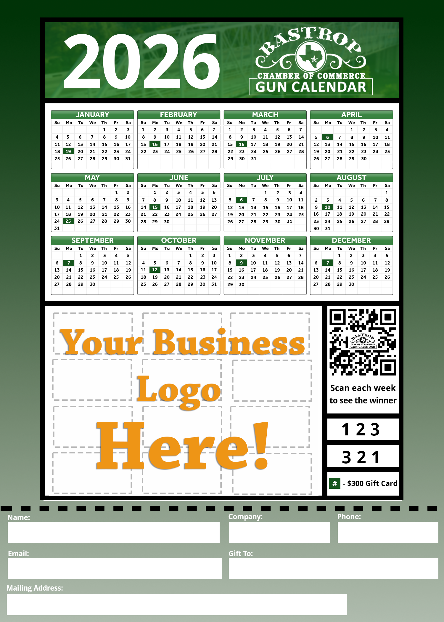 • Each calendar is $125, which enters the purchaser into the drawing for 1 item per week of the 2025 calendar year. The calendar features 40 guns and 12 $300 gift cards.
