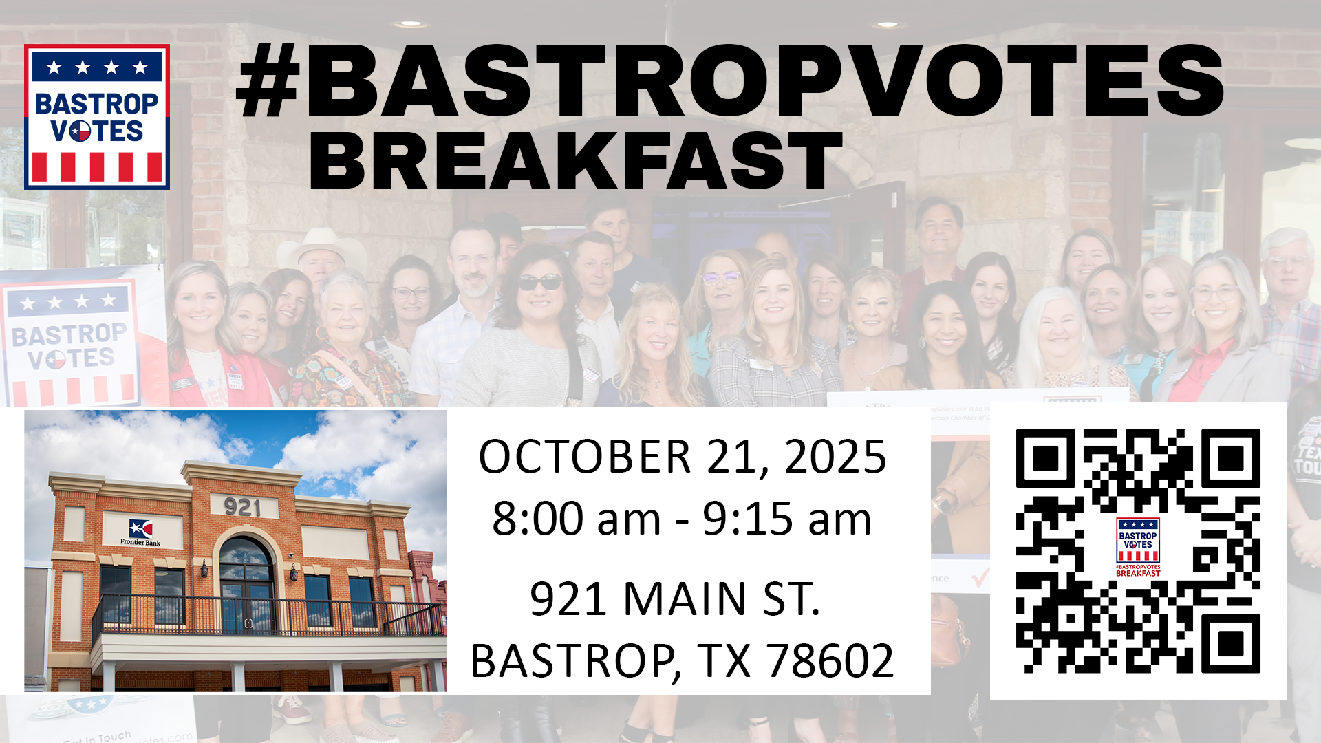 As part of our BastropVotes.com initiative, our Governmental Affairs Committee actively "Promotes the Vote!" In order to accomplish this and get voters to the polls, we are hosting a breakfast. Join us for a delicious breakfast with fellow members and community leaders. After breakfast, walk to the Bastrop County Courthouse as a unified group to cast our ballots for the November 5th election.