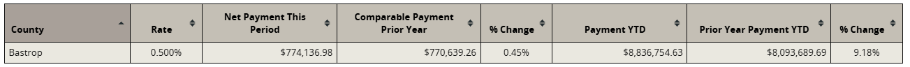 The sales tax allocations for November (primarily September sales) are below. Here’s the link to the State Comptroller’s website if you would like additional information: http://www.comptroller.texas.gov/transparency/local/allocations/sales-tax.